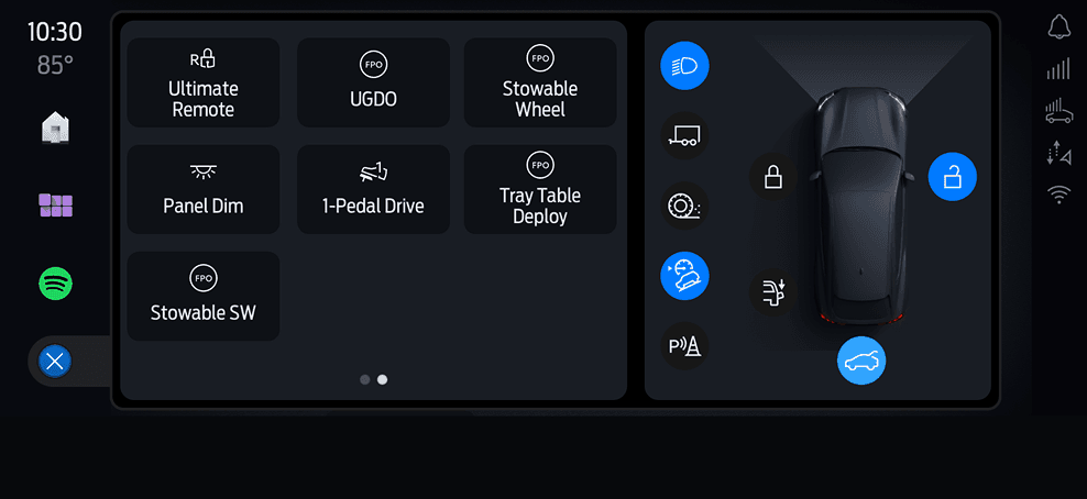 We designed a flexible framework that adapts to driving context—minimizing distractions while still supporting rich vehicle interactions when needed. The focus was on clarity, safety, and spatial awareness,