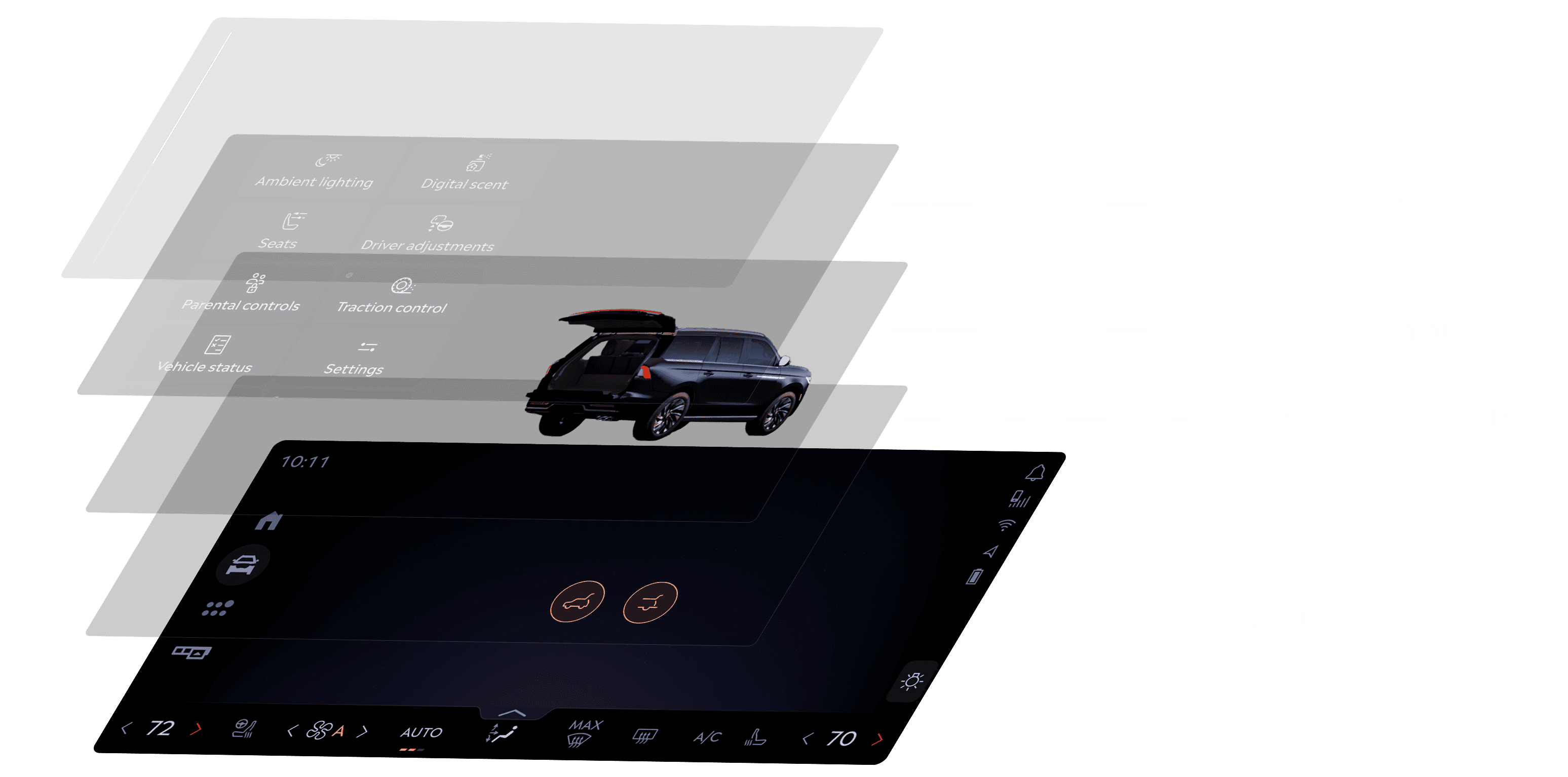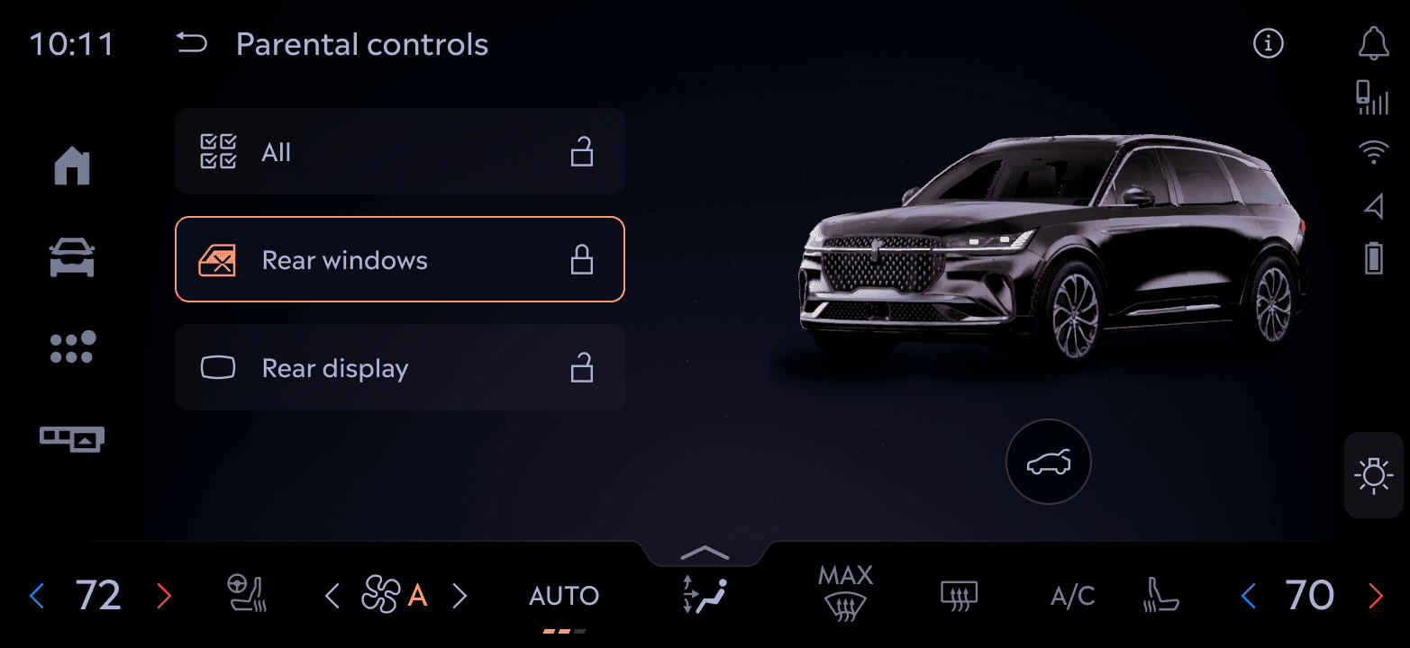 A look at how various control modules like Vehicle status, Parental Controls, Lighting, and more leverage this system. Some tap into the 3D avatar for immersive feedback, others remain lightweight for speed.
