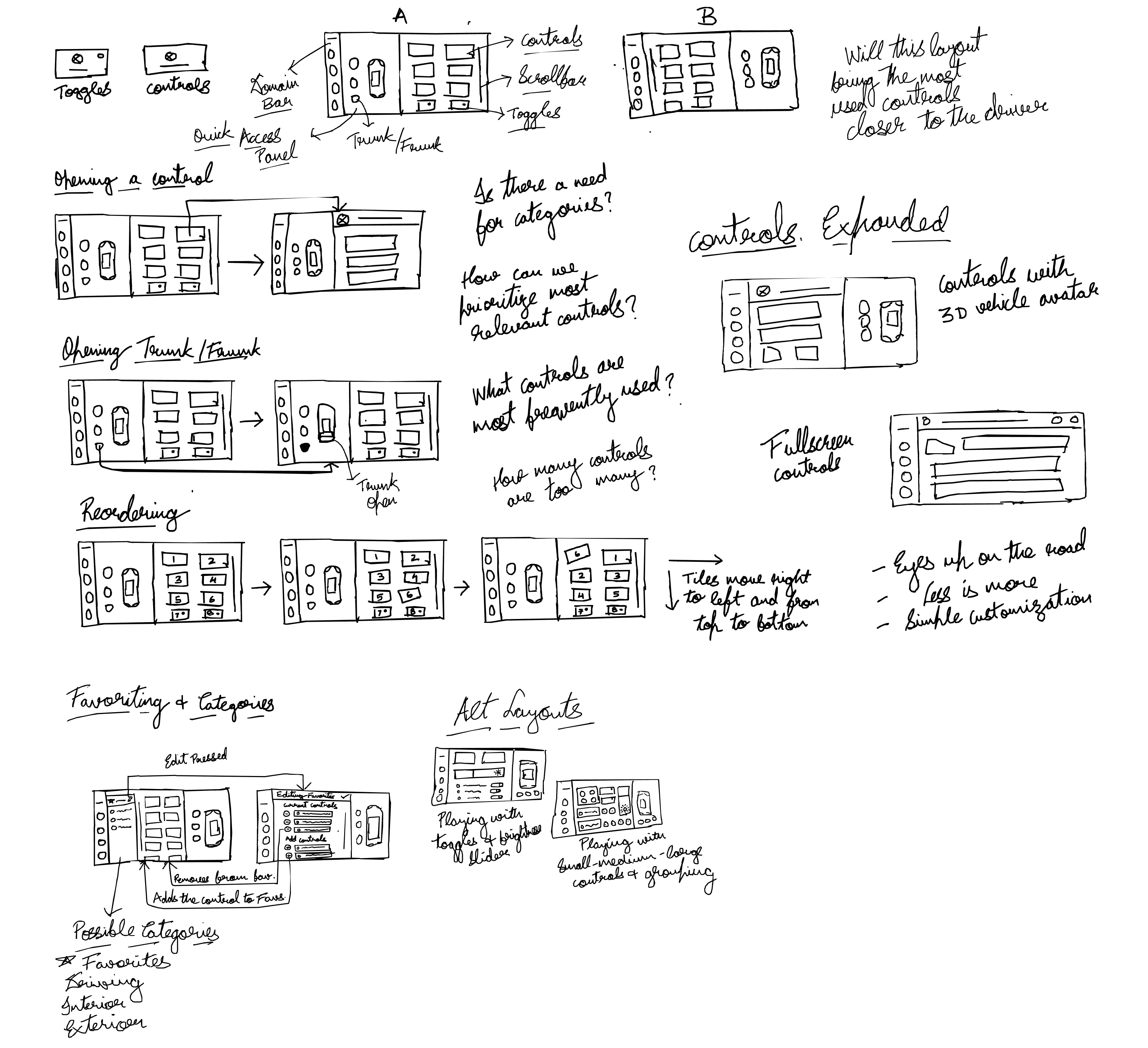 A collection of initial ideas, layouts and user-flows that I sketched using user insights and Ford OS design principles.